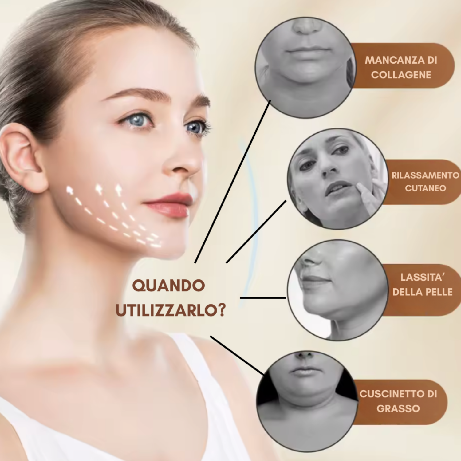 Scopri il Massaggiatore Vibrante per Sollevamento Facciale V, il dispositivo innovativo che combina la fototeriapia a LED e massaggio a vibrazione, per ridefinire i contorni del viso. Progettato per contrastare il doppio mento e sollevare le guance, aiuta a ottenere un profilo più tonico, compatto e definito in pochi minuti al giorno.