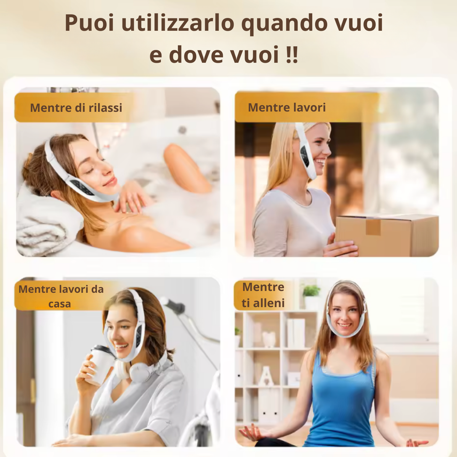 La sua cintura ergonomica avvolge delicatamente il viso, agendo in profondità su doppio mento, contorno mandibolare e guance. Ogni sessione aiuta a ridurre il rilassamento cutaneo e a rimodellare i lineamenti, donando un aspetto più giovane, disteso e armonioso.